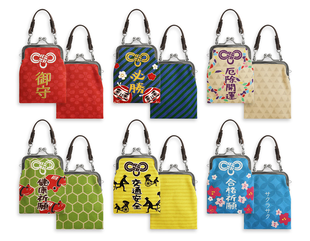 バッグの持ち手に取り付けられる、ユニークで便利なお守りケース。「御守」や「厄除開運」「健康祈願」など、可愛らしいイラストとともに言葉が添えられた、お守り風のオリジナルデザインです。大切なお守りを入れるケースとしてはもちろん、ミニ財布や小物入れとしても使えます。