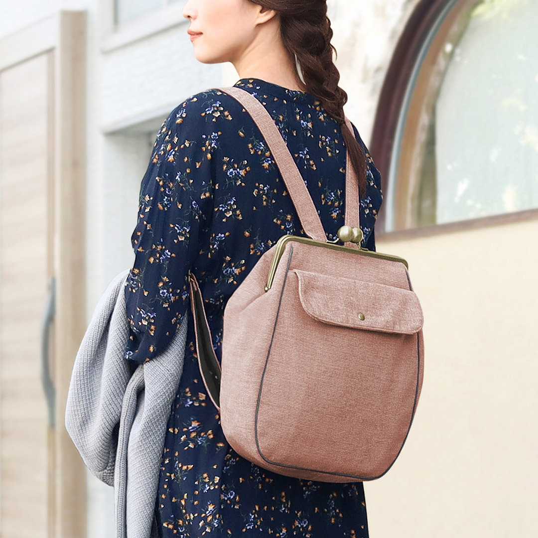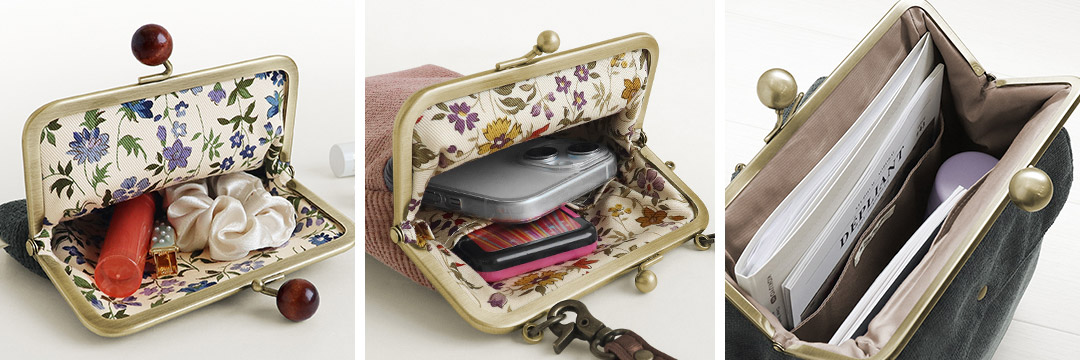 大玉がま口スクエアフラップリュック ¥20,900 / がま口お散歩ポシェット ¥5,940 / 4寸がま口平ポーチ(マチ有) ¥2,970