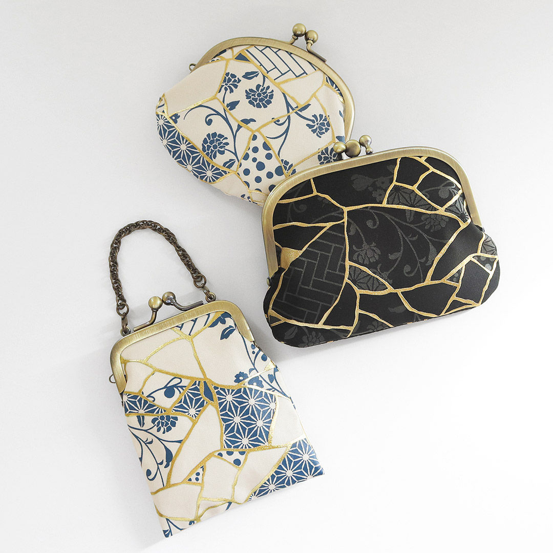 馴染みのある綿100%の生地をベースに、昔ながらの文様や洋風のパターンなどを器の欠片に見立てており、その上に発泡箔をのせて金継ぎの世界観を表現しています。陶磁器の中でも美しい青が印象的な呉須(ごす)と、つややかな黒漆(くろうるし)の2色展開。