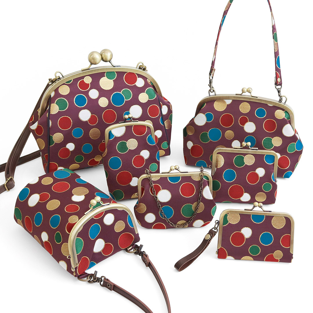深みのある紫地にカラフルな水玉柄がモダンな「伊達ドット」を金襴で表現した、帆布とはひと味違う、より上品で華やかなシリーズです。