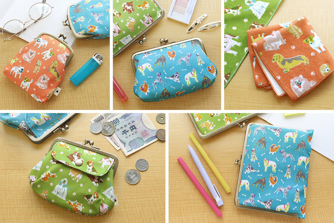 22cmプチタオル ¥880 / がま口シガレットケース ¥2,365 / がま口スクエアポーチ ¥2,640 / がま口ブックカバー500 ¥3,960 / ポケット付き親子がま口財布 ¥4,950 / がま口お散歩ポシェット ¥5,940 / トートバッグ(チャーム付き) ¥8,470
