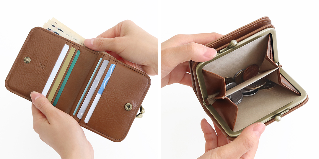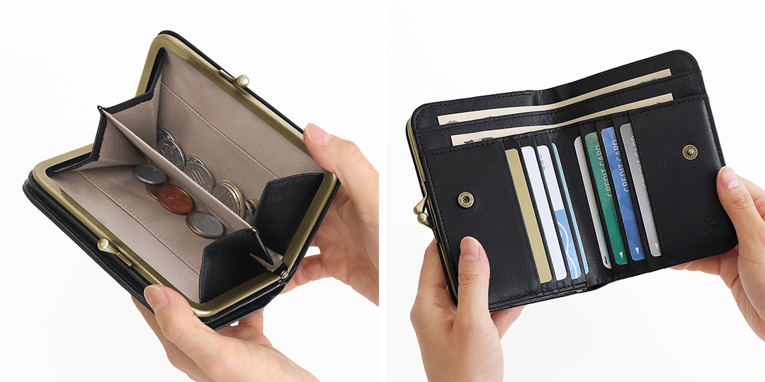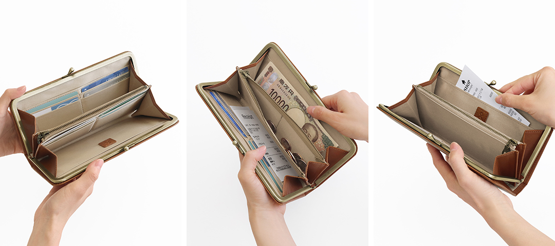 がま口を開けば、8枚のカードが収納できるカードポケットとフリーポケットが2つあり、カード類やお札、レシートを分けて収納可能。小銭入れはファスナー式になっています。