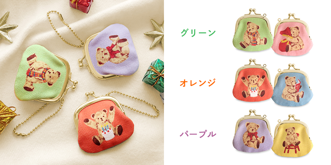 1.7寸ミニがま口チャーム ¥1,760 / 山型がま口メガネケース ¥3,190 / 革ヒモ付き手提げがま口財布 ¥3,465 / 三枚口ポーチ ¥3,465 / がま口トラベルポーチ(ライト) ¥4,950