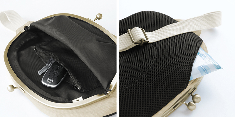 外側の背面は通気性・クッション性の良いメッシュ素材を使用しており、ハンカチやポケットティッシュなどが収納できるポケット付き。がま口専用ロック「がまろっく」も付属しています。