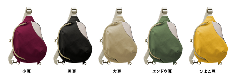 8号帆布にナチュラルな風合いのヌメ革がアクセントに。カラーは豆の種類からそのまま取った、小豆・黒豆・大豆・エンドウ豆・ひよこ豆の5色展開です。