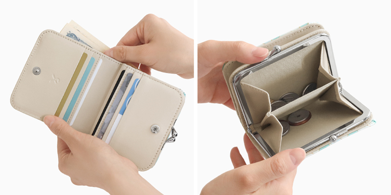 お札入れは1部屋のシンプルな作りで、6枚のカードが収納できるポケット付き。がま口内は仕切りで2部屋に分かれた小銭入れになっています。