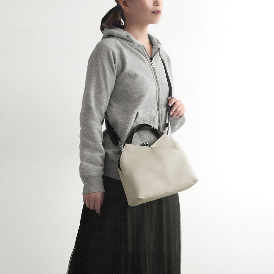 V字カットのラインからひねり玉がのぞくレイヤードスタイルの「がま口レイヤードショルダーバッグ」。ハンドバッグとショルダーバッグの両方で使える2WAYバッグです。