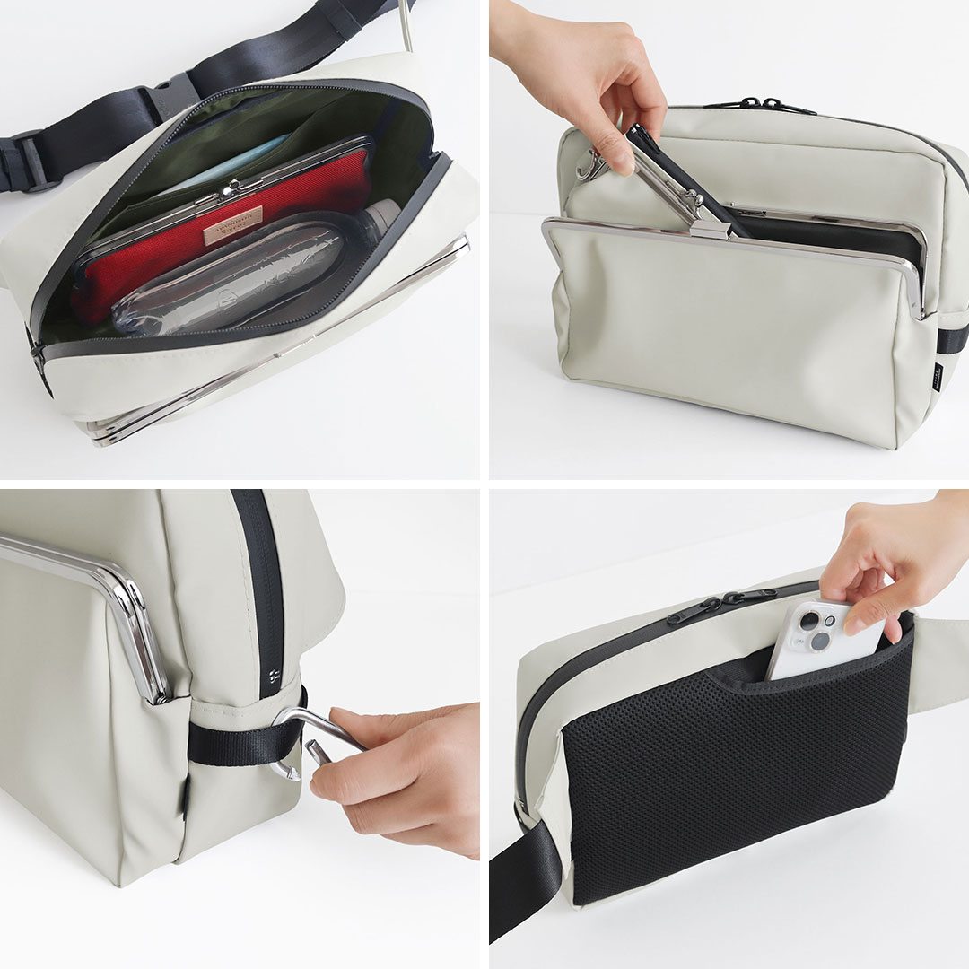 長財布や500mlのペットボトルも入るWファスナー(止水ファスナー)仕様メイン収納と、外側正面にはしっかり閉まる起こしひねりのがま口ポケットがあります。