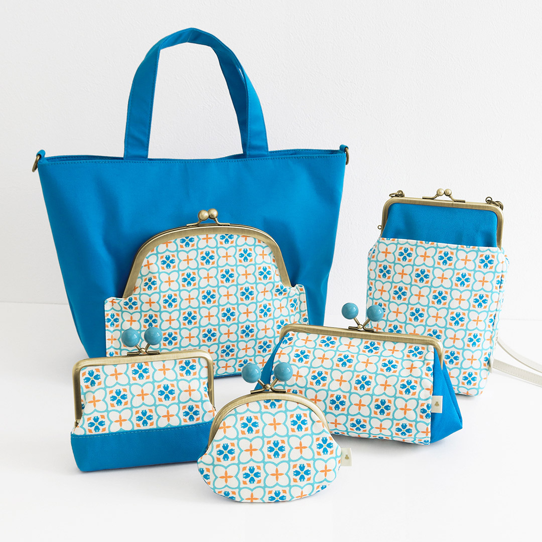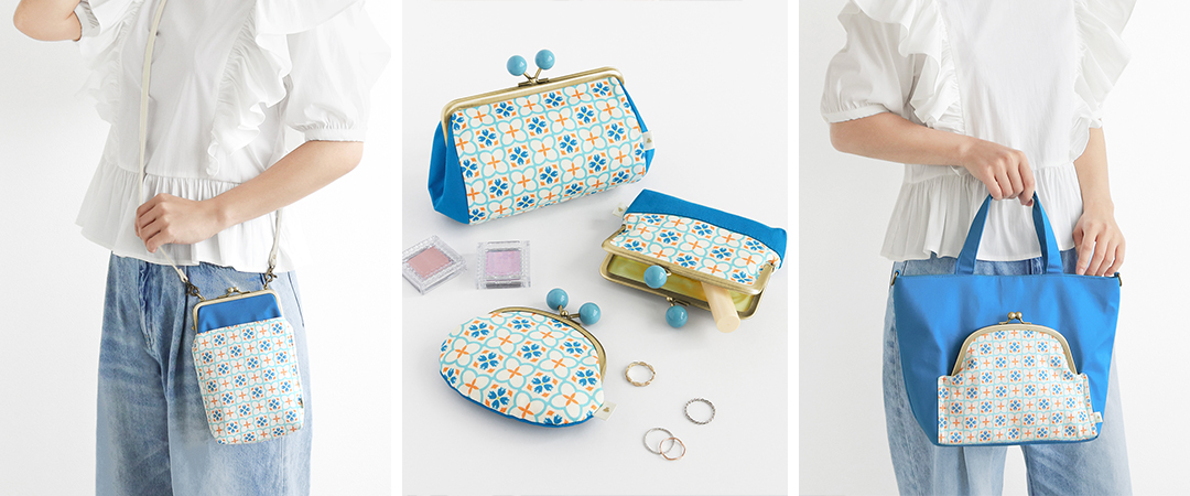 横浜の港町をイメージしたタイル柄の限定シリーズ。爽やかなカラーリングと、モロッコタイルやマジョリカタイルのような異国情緒ある雰囲気が魅力的なオリジナルテキスタイルを、柔らかな肌触りの綿ツイルにプリントしています。サブ生地や小物アイテムのひねり玉に使用している、鮮やかなマリンブルーとのコントラストが映えるデザインです。