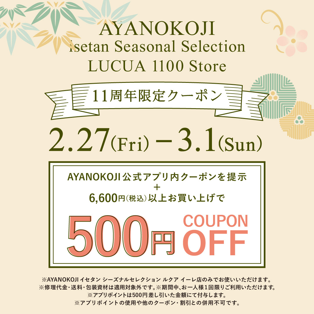 イセタン シーズナルセレクション ルクア イーレ店にて期間中6,600円(税込)以上のお買い上げで、アプリの500円OFFクーポンをご利用いただけます!ぜひこの機会にお買い物ください♪