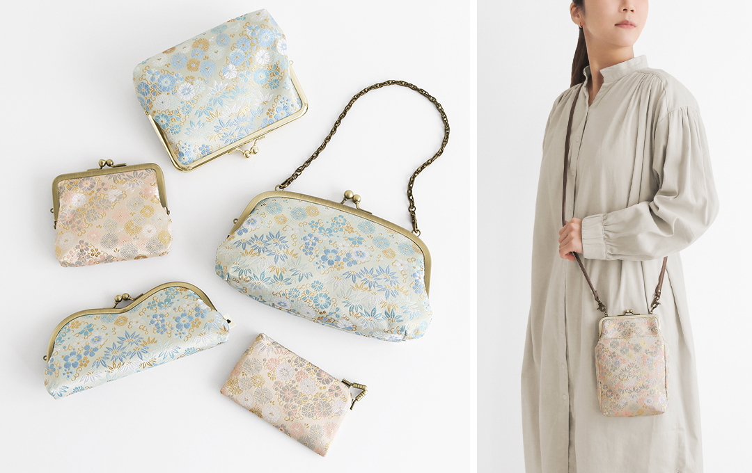 華やかな金襴シリーズの限定柄が登場!縁起の良い松竹梅を菱形の形状に配した<菱形松竹梅>を白梅・水色の2色で展開。薄い地色に金糸や色糸が映える柔らかな印象の金襴生地です。小物アイテム中心のラインナップで、贈り物にもおすすめです。
