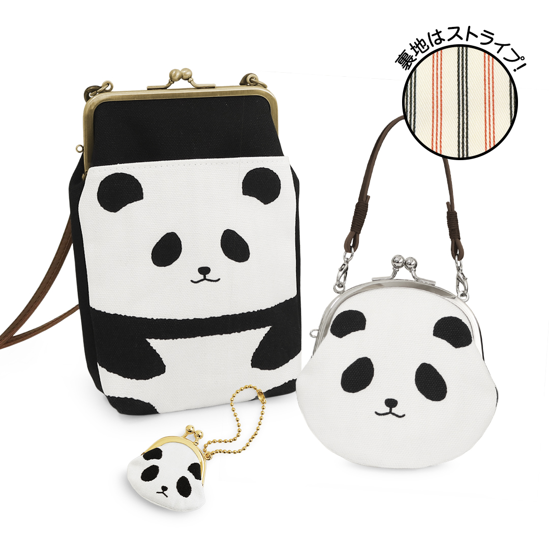 小銭が入るストラップ、丸い形の持ち手付き財布、ちょっとしたお出かけにおすすめのポシェットの3アイテムをご用意しました。また、財布とポシェットは裏地にストライプの生地を使用しており、シンプルなモノクロカラーのアクセントになっています🐼