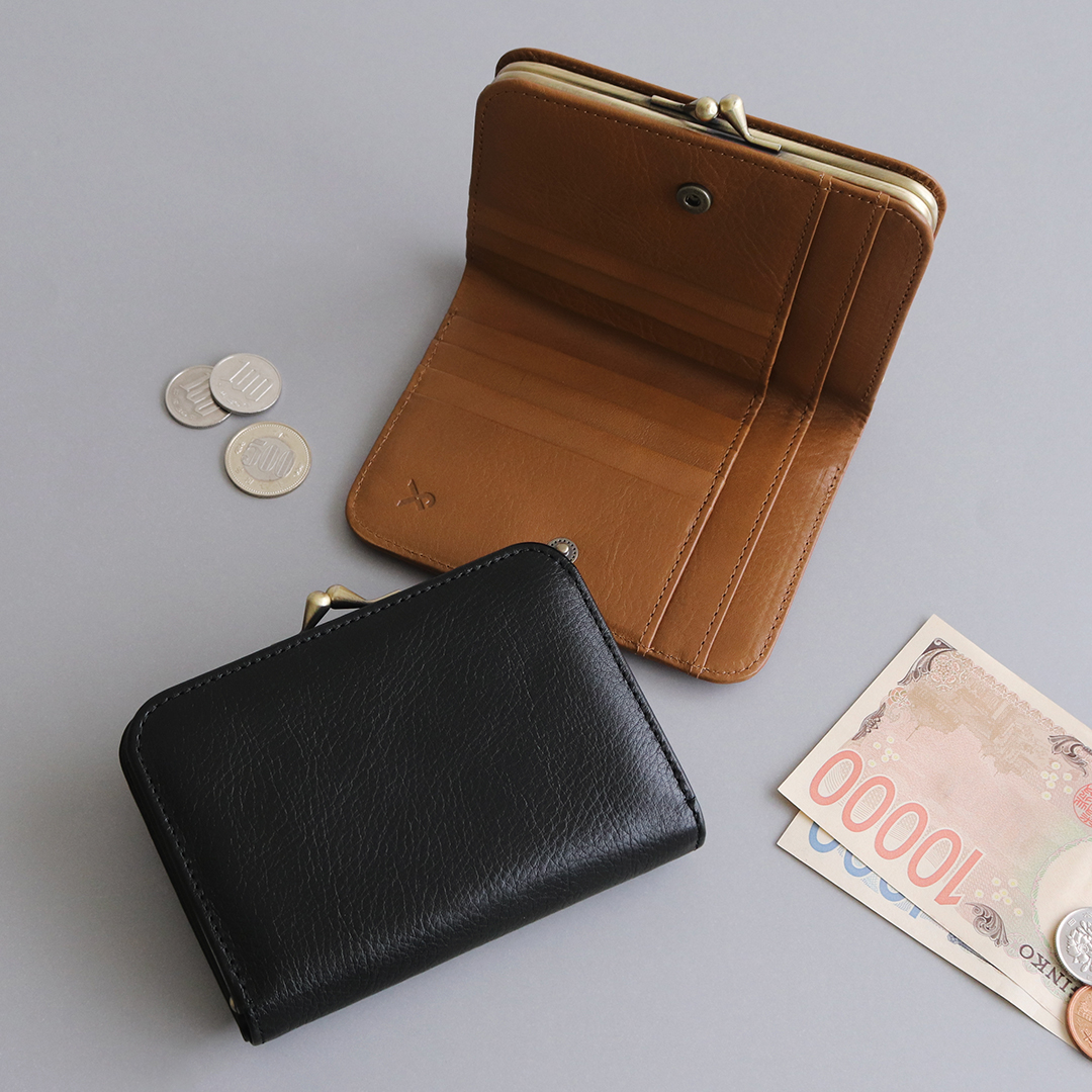 二つ折りがま口コンパクトウォレット ¥17,600 / 二つ折りがま口スクエアウォレット ¥22,000 / がま口ロングウォレット ¥24,200