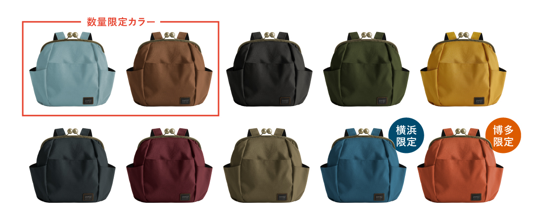 軽量で堅牢度に優れ、テフロン加工による撥水・防汚機能も兼ね備えたコーデュラ®を使用。定番カラーは全店舗共通の6色と、横浜ジョイナス店限定でマリンブルー、アミュプラザ博多店限定でオレンジを展開します。