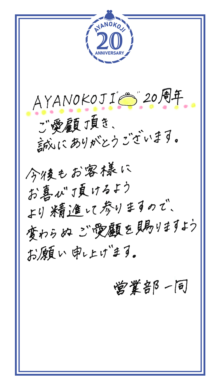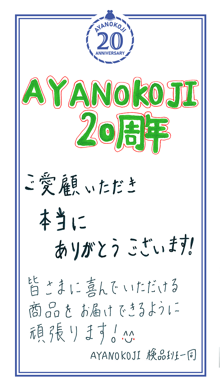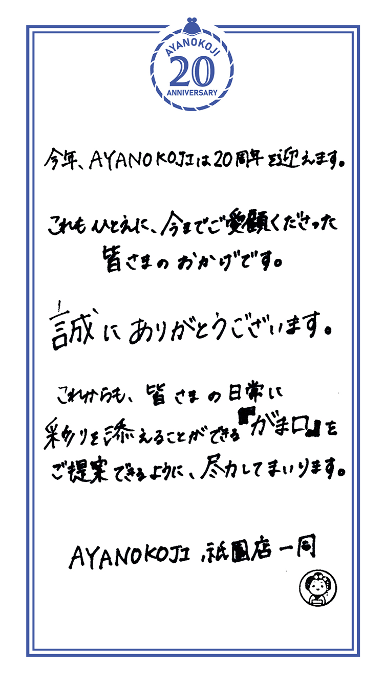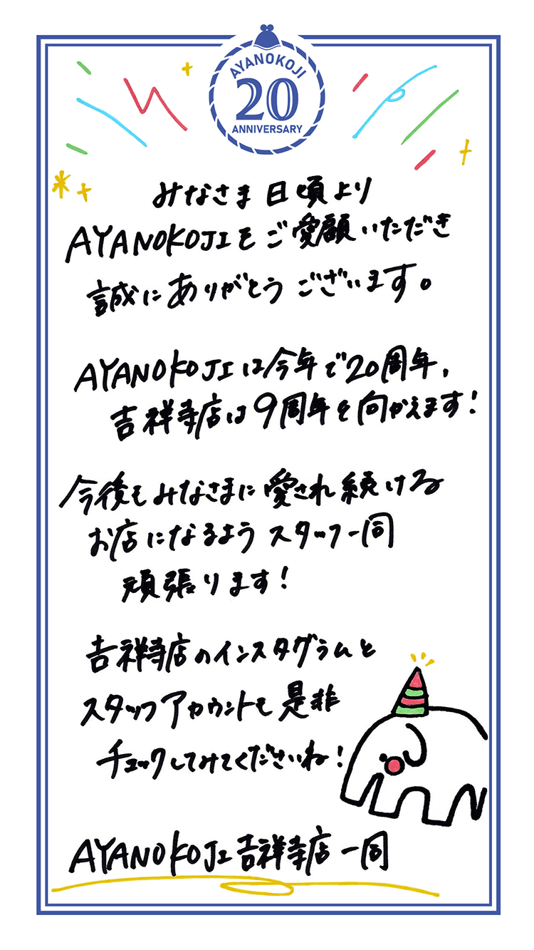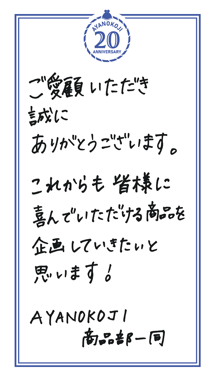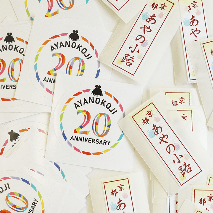 カラフルな20周年記念ロゴデザインの丸型ステッカーと、ブランド立ち上げ当時の「あやの小路」の文字でデザインした千社札の2種類をご用意。