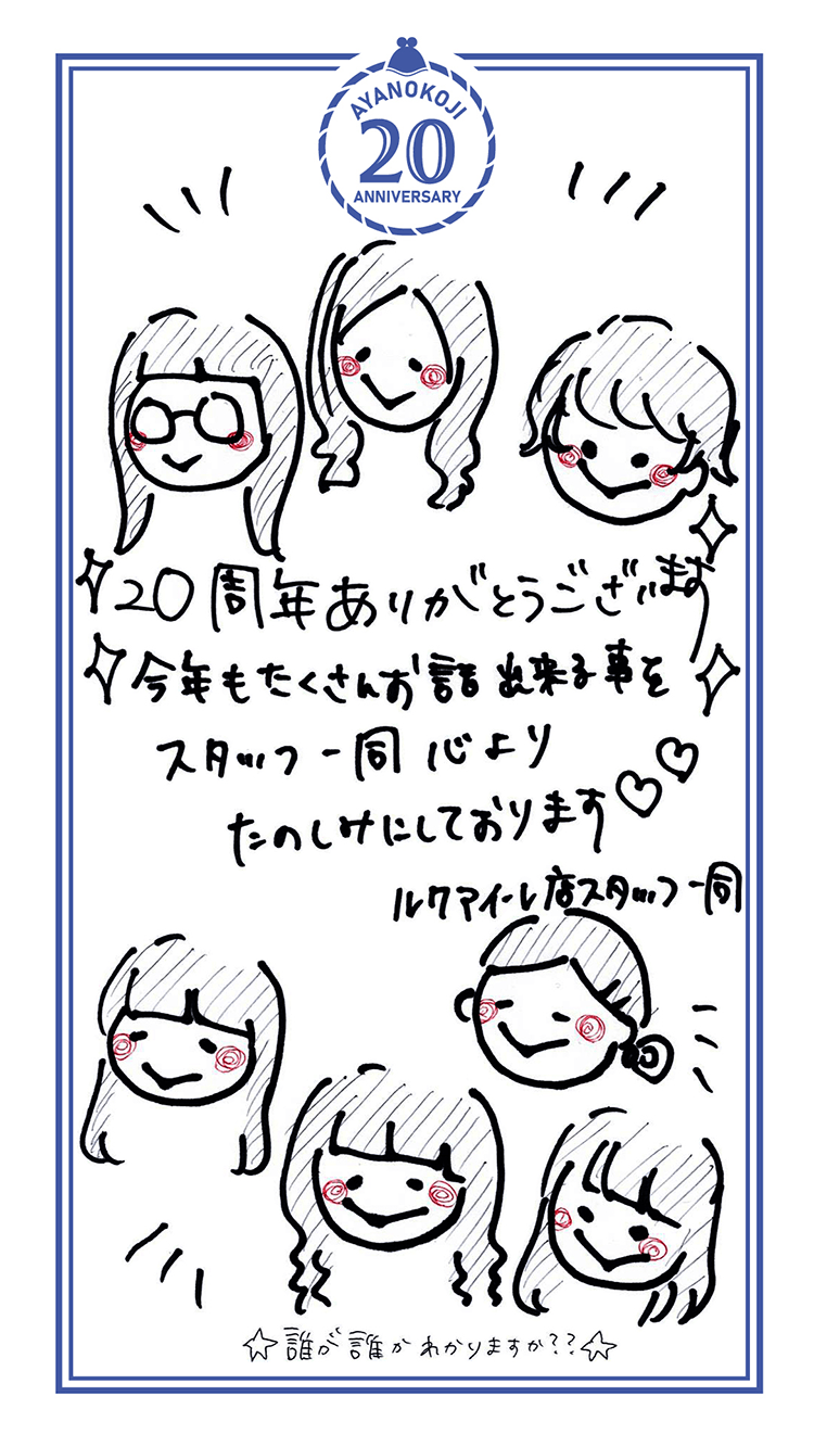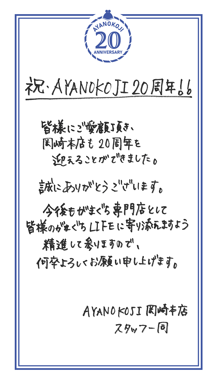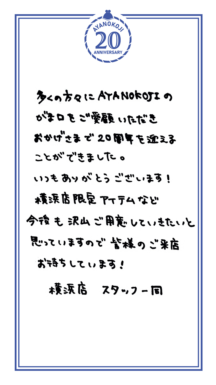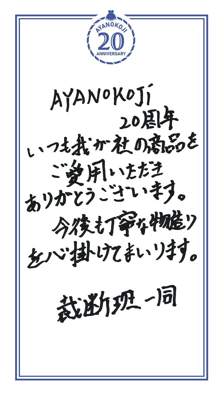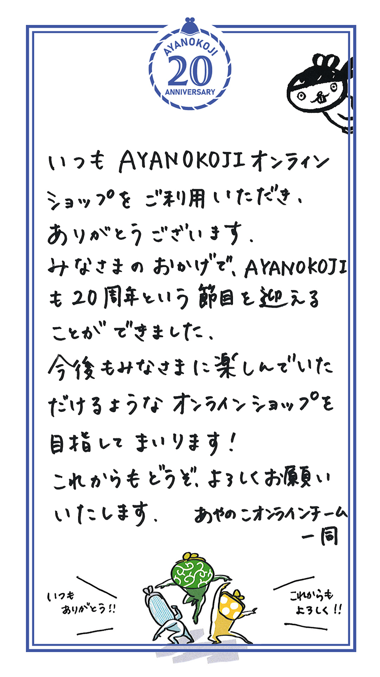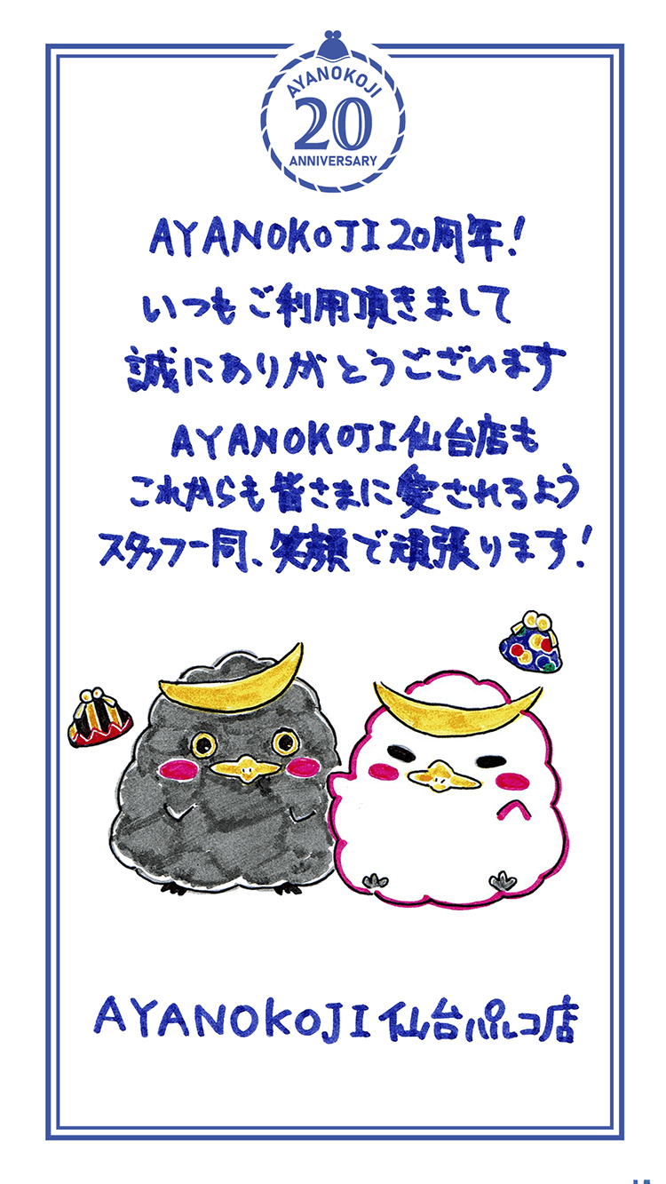 カラフルな20周年記念ロゴデザインの丸型ステッカーと、ブランド立ち上げ当時の「あやの小路」の文字でデザインした千社札の2種類をご用意。