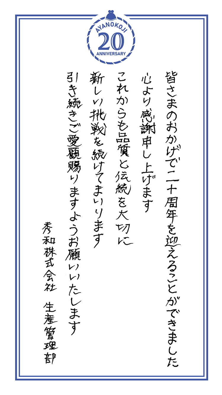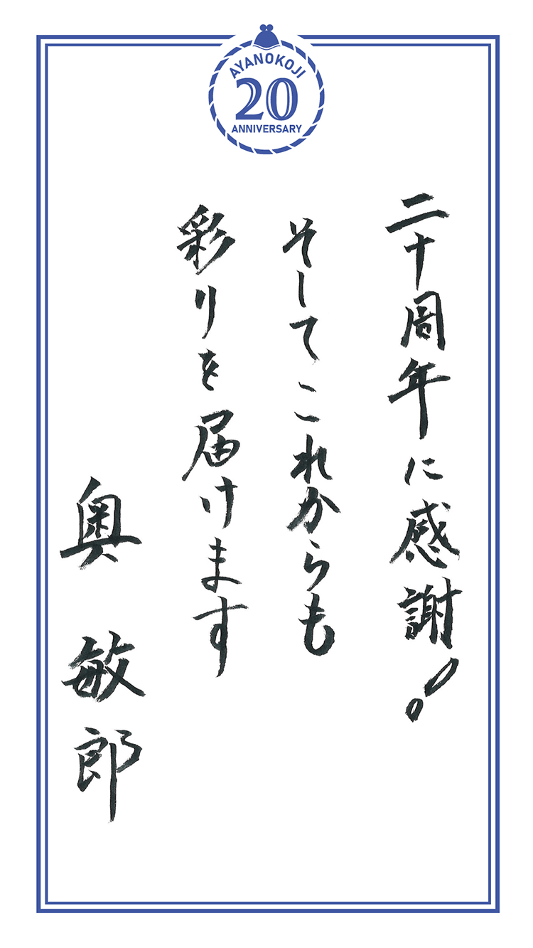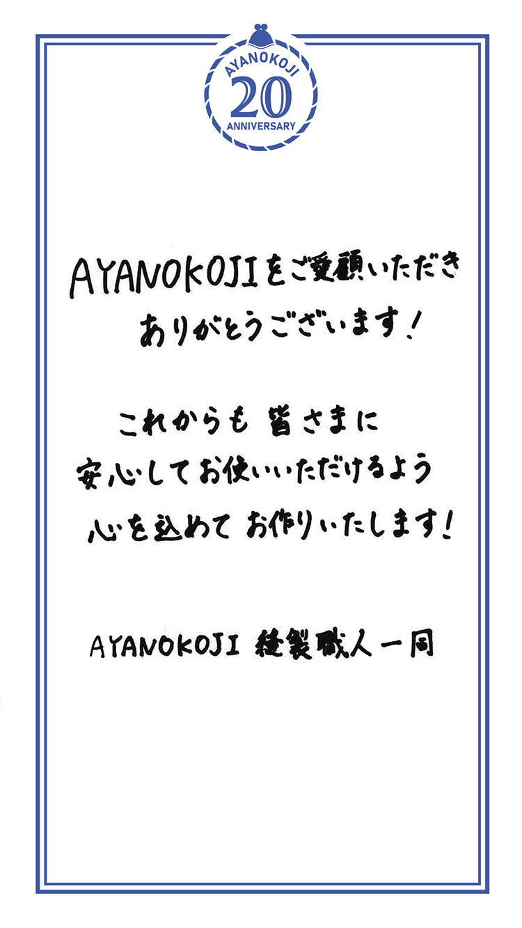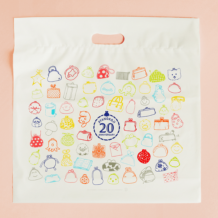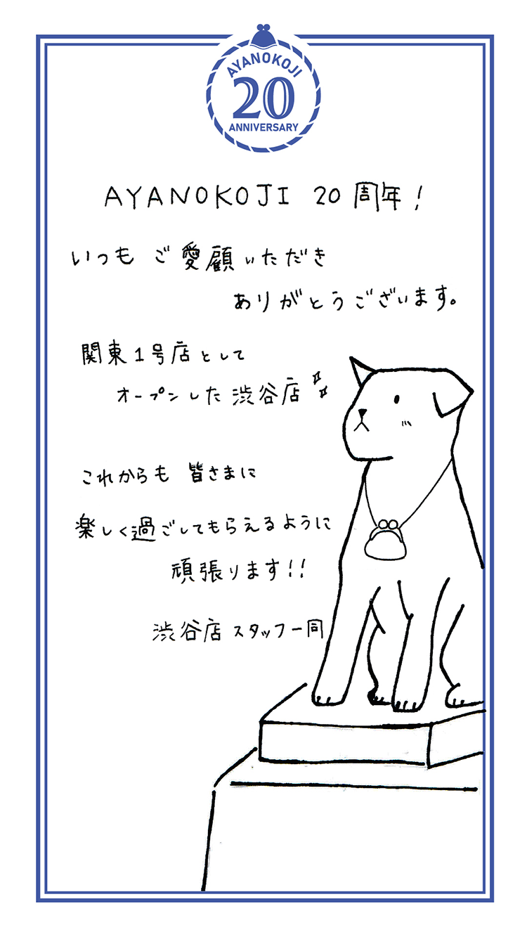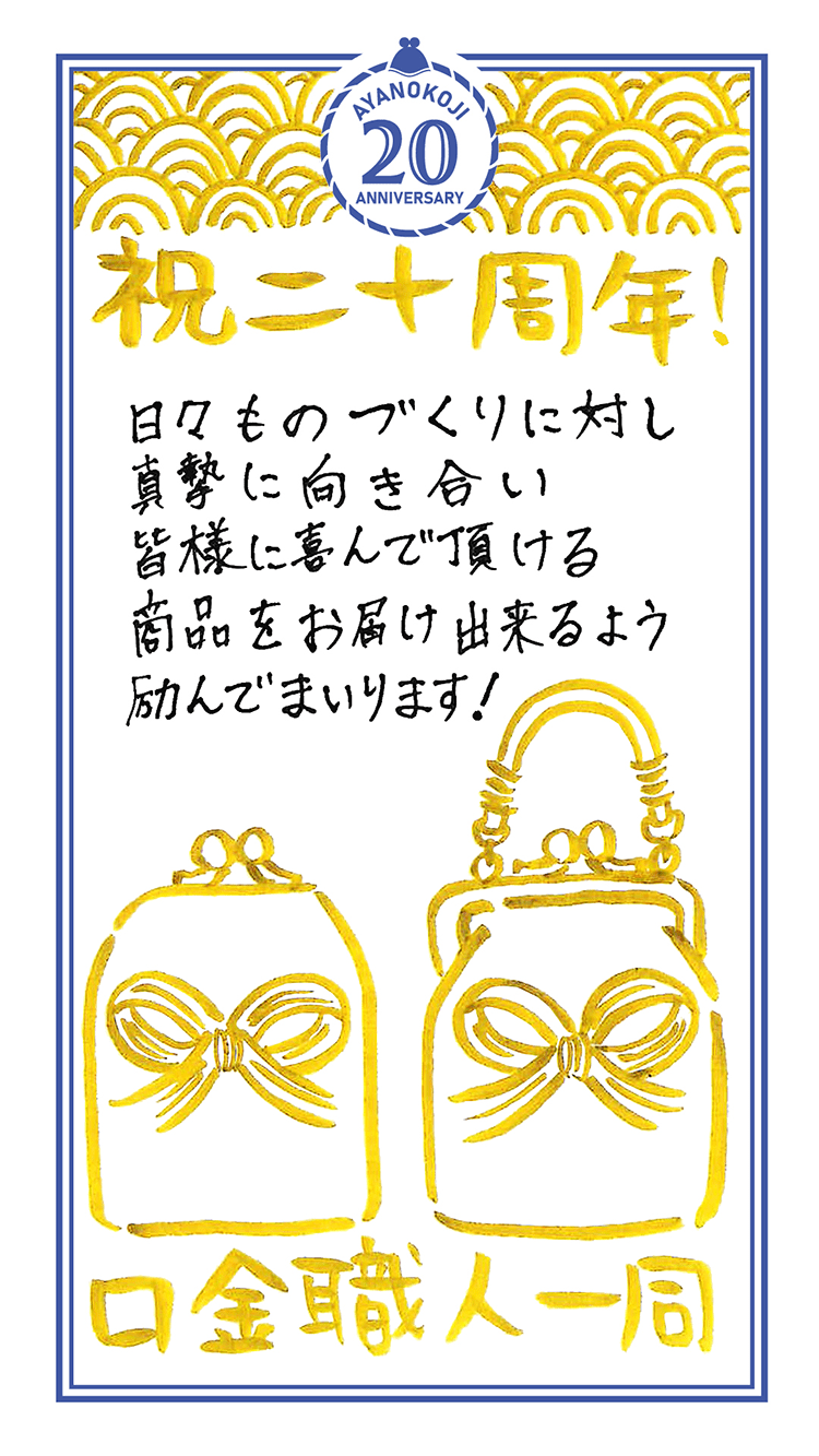 カラフルな20周年記念ロゴデザインの丸型ステッカーと、ブランド立ち上げ当時の「あやの小路」の文字でデザインした千社札の2種類をご用意。