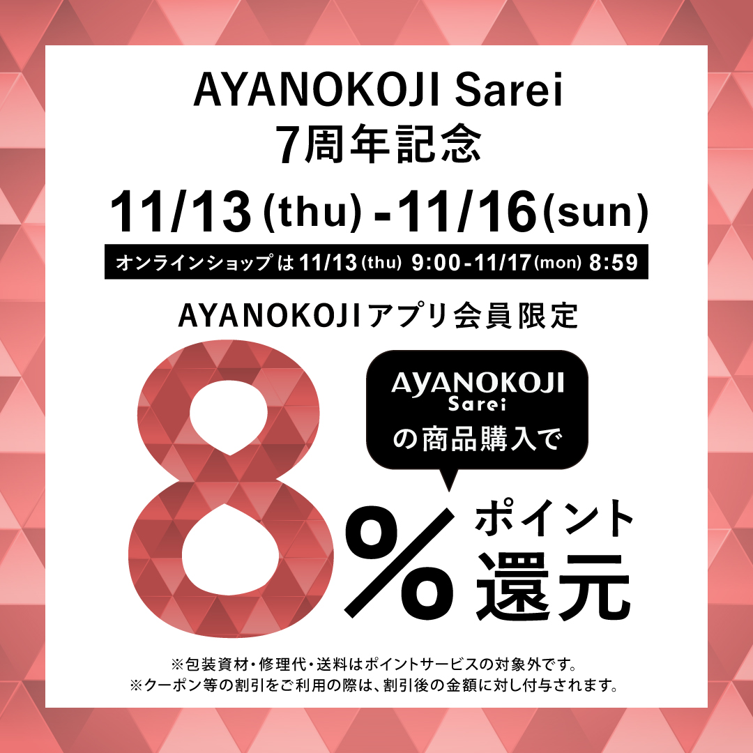 11月13日(木)~11月16日(日)の期間中、AYANOKOJI Sarei 商品のご購入に対してアプリポイントを8%還元!ぜひこの機会にお買い物ください
