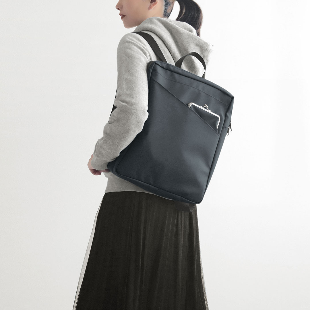 A4サイズも収納可能でスマートな「がま口スマートリュック」。斜めにカットされたオープンポケットから、ちらりと見えるがま口ポケットがアクセントの薄型リュックです。